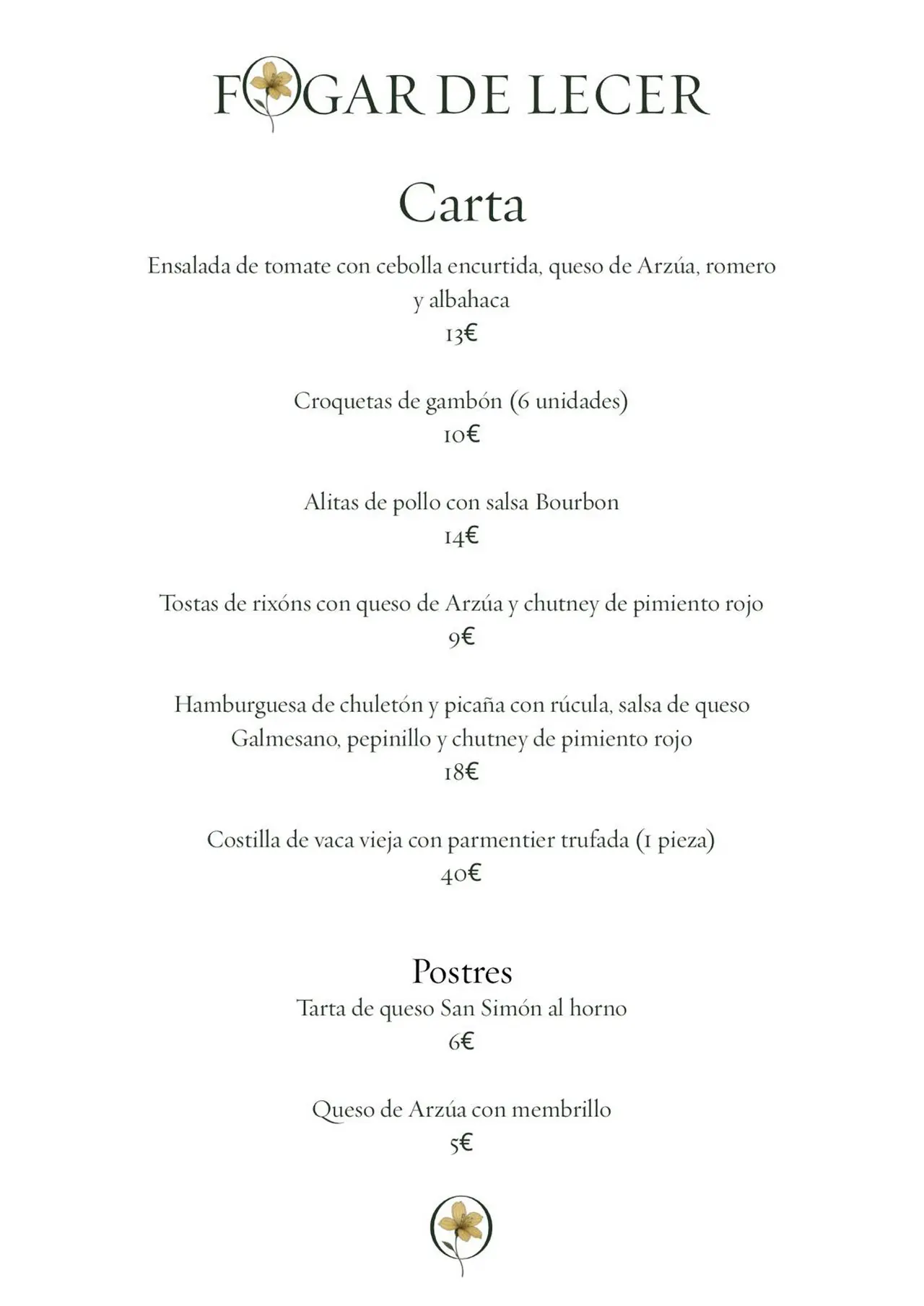 Desde noviembre de 2025, contamos con licencia de hostelería para ofrecer servicio de restaurante también a personas no alojadas (solo bajo reserva). Les adjunto nuestra carta, que ofrece cocina gallega con producto local y alma gourmet. Además de la carta actual, ofrecemos siempre platos fuera de carta y de temporada. Para grupos o comidas especiales, preparamos menús cerrados y personalizados, así como menús de Navidad y celebraciones adaptados a los gustos y presupuestos de cada grupo.